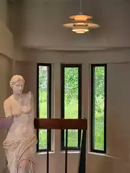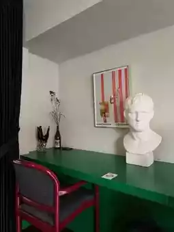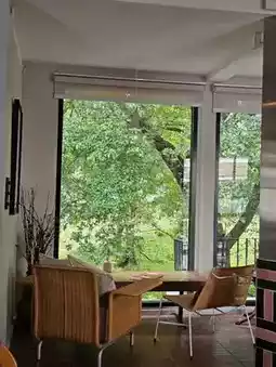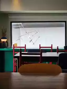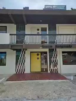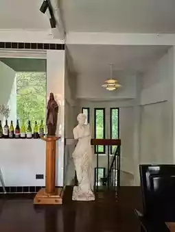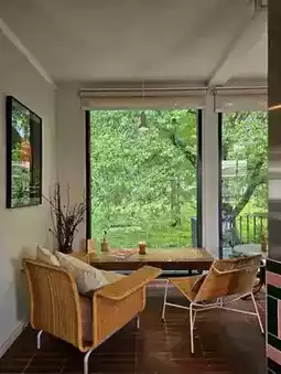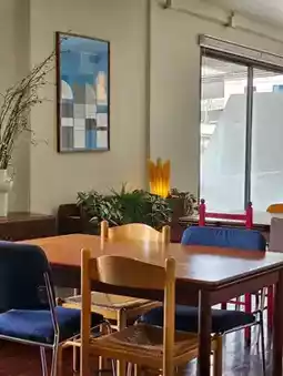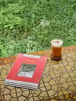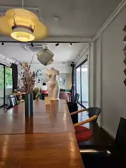 A café and restaurant decorated in a Mid-Century style located in the middle of Rama 9 alley. The café is a house transformed into a restaurant and café, decorated in muted green and pink nude tones, along with retro-style wooden and glass furniture.
