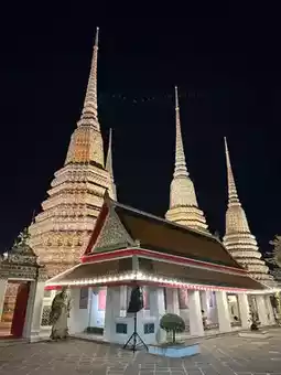 Nighttime at Wat Pho is Magic Hour – lights reflecting off the golden chedi walls, perfect for photos from the reclining Buddha angle, the main ordination hall, and the classic stone walkway