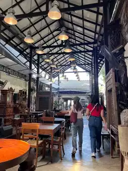 Then stop by Hong Xiang Gong Café, a riverside lifestyle café by the Chao Phraya River with a semi-vintage, ancient Chinese atmosphere. They offer drinks, desserts, and meals to enjoy in a chill setting. The photo spots here are excellent. Next to the café is the Zhou Si Gong Shrine, where people often come to pray for health. The shrine also has parking available.
