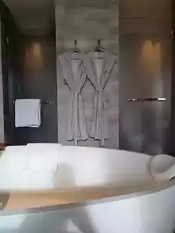 The wash area is square and spacious, with an extra-large standalone bathtub 🛁 in the center, thoughtfully equipped with a headrest on the side. The double sinks are grand, and between the two mirrors is a glass window that looks out onto the balcony, from which you can enjoy a distant view of the Chao Phraya River. Amenities are from labottega. There are two types of bathrobes, thick and thin. The slippers are surprisingly cotton flip-flops. The toilet is not a smart model.