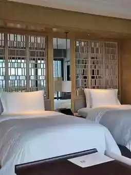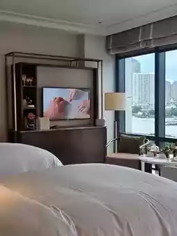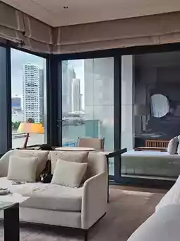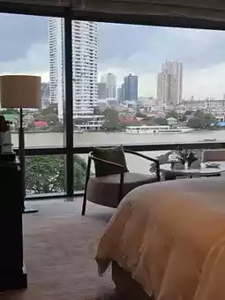 The floor-to-ceiling windows in the living area offer a beautiful view of the Chao Phraya River. The mattress is Sealy, thick and soft, very comfortable. The bedding feels extremely skin-friendly. The bedside sockets do not require adapters and also include USB ports.