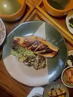 * Koji marinated grilled salmon rice set and Nen sauce sautéed mushrooms