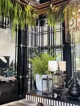 The garden features palm trees and exotic flowers in perfect harmony. In the morning, soft sunlight filters in accompanied by birdsong, and in the evening, subtle lighting adds a romantic ambiance. 🌇🌴✨