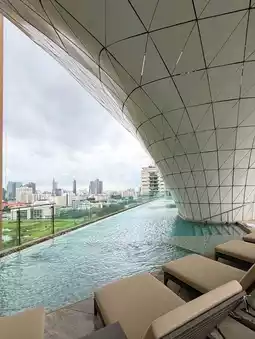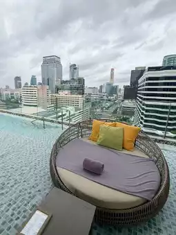 Another favorite spot is the swimming pool on the 16th floor! You get stunning views of both the golf course and CentralWorld. The day I visited, the weather was perfect with a cool breeze. The pool area was quiet and peaceful, ideal for relaxing both day and night. The poolside vibes are simply amazing.