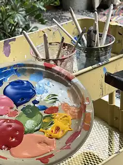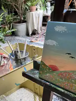 There are many seats available and plenty of photo spots. If you want to paint, you'll need to purchase a canvas frame from inside, which comes in various prices. The cafe provides easels, aprons, cups, brushes, palettes, and bottles of poster paint for you to refill as much as you want. It's incredibly convenient.