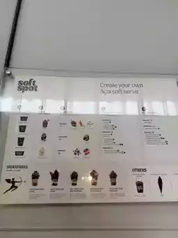 The soft-serve menu includes the main flavors: pure acai, tropical acai, and cacao. There are also special flavors that change regularly. The pure acai is sugar-free and banana-free, which we really liked. It comes with a variety of toppings, including fruits, grains, and crunchy options.