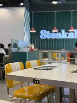 The restaurant boasts a striking 90s American decor, featuring green, yellow, white, and black tones, creating a chic retro atmosphere. The spacious restaurant offers plenty of seating and plenty of photo opportunities. Steaks start at just 99 baht, making them affordable for students. Popular dishes include spaghetti with dried chili and bacon, spicy chicken steak, and spaghetti carbonara. The restaurant frequently offers promotions. When we visited, they offered a steak promotion with unlimited rice refills for just 169 baht.