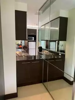 I took the elevator to my room. There's no keycard required. You can just press the floor. Exit the elevator and you're in your room. Upon entering the room, you'll find a kitchen area, a dining table, a work desk, and a bedroom with a large bed. The bathroom has a bathtub and a bidet. The room is very spacious, and the balcony is very spacious. The room was okay, clean, not too old and not too new, just average. For the price of 1900, this size of room is very okay. However, it might be a bit far from the train station.