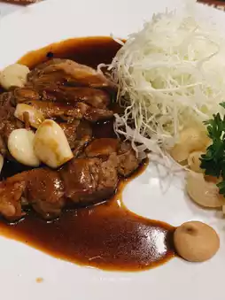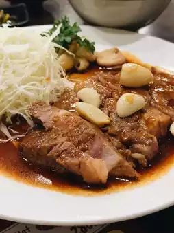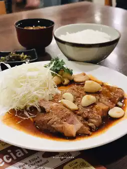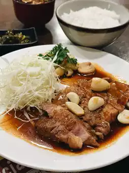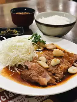 Tonteki Set (Kobe Tonteki), an original Japanese recipe featuring premium pork cutlets, sous-vide, grilled, and topped with a special sauce. Served with garlic confit (soft, creamy garlic).
