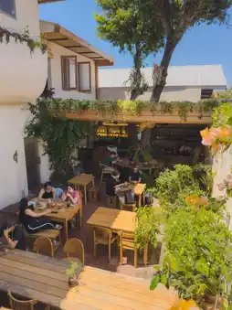 🌳🪜 The café is designed in a Santorini style, offering both indoor and outdoor seating options. It features beautiful photo spots, including a thousand-year-old olive tree perfect for capturing memorable pictures.