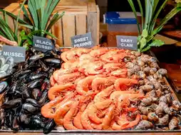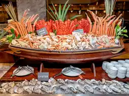 Feast on Alaskan king crab, snow crab, blue crab, along with a range of seafood like rock lobster, river prawns, oysters, mussels, and more—all on ice and replenished continuously.