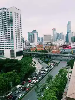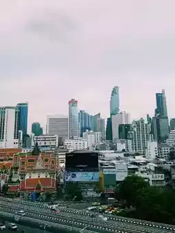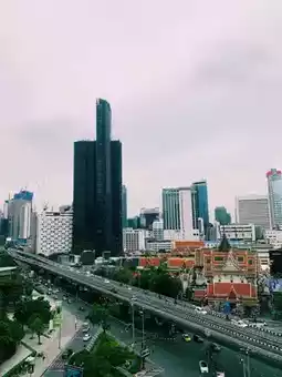 We can see a temple, soaring buildings, the roads, the traffic and the famous Mahanakhon building, featuring a pixelated exterior design.