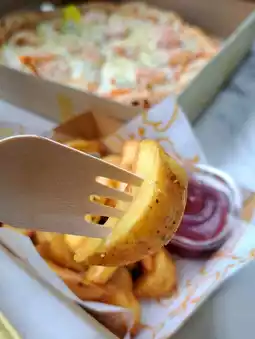 The cafe offers both outdoor and indoor seating, each beautifully designed and surrounded by nature. Enjoy a relaxing 🍕Hawaiian Pizza, 🥔Patato Wedges🥤, and an espresso. This cafe is a great place for couples, friends, and families, especially those with children.