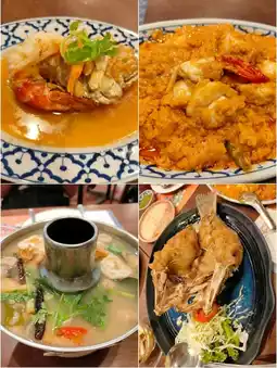 🥘Stop for lunch at Kung Thong, a Thai restaurant with a great atmosphere and delicious, fresh food. We ordered four dishes, the restaurant's recommended dishes: the fried shrimp with salt (they were huge and the meat was so bouncy, it's a must-order), and the fried sea bass with fish sauce. Stir-fried crab with curry powder, seafood tom yum, and dessert: fresh coconut milk pudding. Total cost: 3,625 baht. For 4 people, it came to about 906 baht per person.