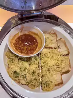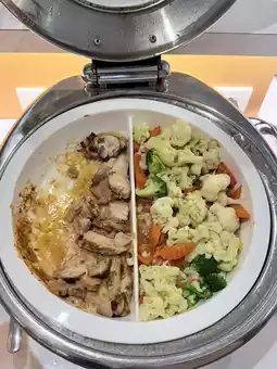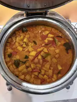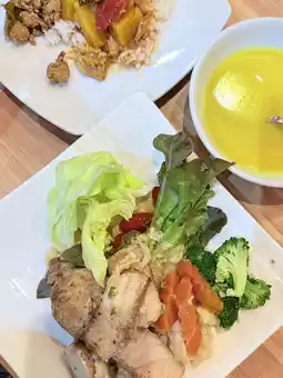 - Main meals (rice, pineapple curry, stir-fried vegetables, roast pork, salad)