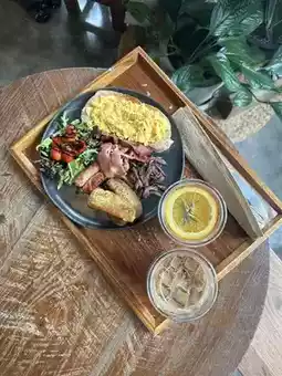 ☕️ Indoor zone for a relaxing coffee and meal, cool and comfortable, with tables for working.