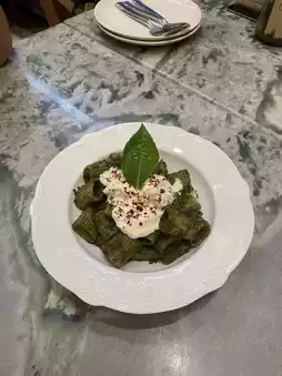 If you like pasta with pesto sauce, you'll love this one. The green color is so vibrant. I'm not sure what this type of pasta is called, but it goes perfectly with the pesto sauce. The large pieces of white cream sauce taste like cheese. Put it on top and eat it with the pasta! It's a perfect match!
