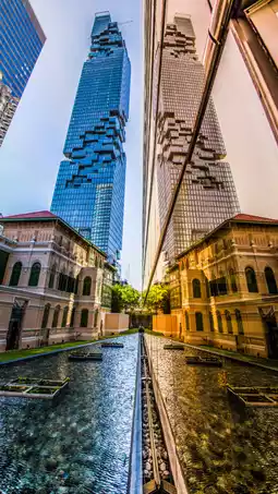🧊 The “pixelated” design makes the building look like it’s been hacked with digital art. 🌤️ The clear sky makes the structure look bold and powerful. 🏗️ It’s one of the tallest buildings in Thailand—a reflection of progress. 📸 This image was taken from an angle that reveals both its height and its surrounding context. 🏠 The red-roofed building in the front adds a perfect contrast. 🔌 The electric cables running through the bottom give it a “real city” feel, not just a poster. 🇹🇭 The word “MahaNakhon” in the middle of the image in Thai makes it easy to access and clear. 🎨 Suitable for use in lessons on “Architecture and Technology”. 🧠 Encourages students to think about design that reflects the digital age. 🎓 Use in active learning activities such as “Analyzing the Design of the Future”. 📱 Suitable for creating TikTok or Canva content that tells the story of the modern city. 🌍 This building is a symbol of the connection between culture and innovation. 💡 One image... but opens a conversation about "Cities and Creativity" 🚀 Ready to take students on a design-driven journey?