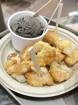 - Signature Kham Nueng Kham Tan (140 baht): These crispy, mochi-like fried dough sticks are incredibly delicious! 10/10! Crispy on the outside and chewy on the inside. The shop fries them perfectly, without being greasy at all. Topped with palm sugar sauce and crumble, they go perfectly with the rich hojicha ice cream. I personally love it so much I recommend everyone to try it!