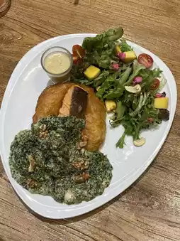 High-quality salmon grilled until crispy on the outside and juicy on the inside. Served with spinach and truffle mushrooms in a creamy sauce, served with crispy roti sheets and soft, crispy roti on the inside. This dish is incredibly mouthwatering!