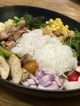 A classic Thai-international dish! Organic vegetables with a rustic nam prik num, plus crispy pork rinds and sai ua (Northern Thai sausage) served with a balsamic vinaigrette. A local organic feel with an "international" twist.