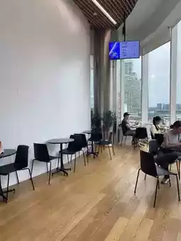 ✨ The highlight is the panoramic view of the skyscrapers, perfect for those who want to work from anywhere. Whether you're alone, working on your laptop, or with friends, the seating is comfortable and not cramped.