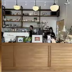 Minimalist decor with wood and white tones, featuring beautiful photo spots 📸. Indoor seating is cool and comfortable, while outdoor seating lets you enjoy the natural breeze 🌞. Equipped with Wi-Fi and power outlets.