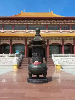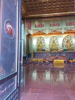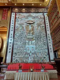 Wat Fo Guang Shan is a temple modeled after a Taiwanese temple. The art and sacred objects within the temple are exquisite, reflecting Taiwanese art. The grand and beautiful main hall enshrines three golden Buddha statues, offering blessings of good fortune and safety. The side walls are intricately carved with the exquisite and magnificent image of the Goddess of Mercy, Guanyin.