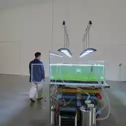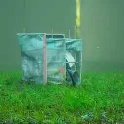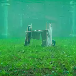 Prachaya Pinthong, a conceptual artist, often challenges viewers to look beyond physical objects and explore their underlying meanings. Using process and real situations as the primary medium for questioning social issues, he uses demolition and reconstruction through his work /|~~~~~~~~~~~~~~~~~~||/| (2025), a glass aquarium-like enclosure constructed from the dismantling of the gallery's door and window panels. Concrete cushions from a parking lot serve as the base of the enclosure. Inside, we find a temporary house-like structure submerged in a glass aquarium perched atop a grassy field. This structure may reflect instability, fragility, and the struggle for survival, but it also opens up new interpretations from the viewer's perspective.