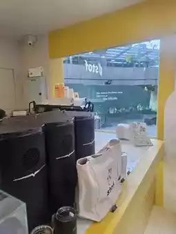 The shop is decorated in a minimalist, bright, and warm yellow and white theme.
