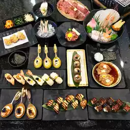 🍣 There's a huge selection of sushi and sashimi, including the Royal Sashimi Set. A collection of delicious items: foie gras sushi, eel foie gras sushi, salmon foie gras sushi, akaebi yuzu sushi, abalone sushi, hamachi avocado shots,
