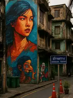 Then, take the MRT or walk to Charoen Krung, a historic district that's become a hotbed of cool street art and stylish cafes. Browse the murals at Talad Noi, stop by cute craft shops like Road of Cinnamon, or sip on creamy soda at Heiwa Kissa.