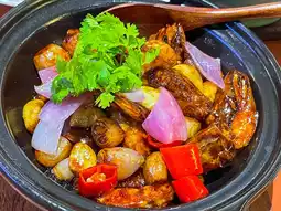 - Stir-fried shrimp in Hong Kong-style sauce, baked in a clay pot, served piping hot and fragrant.