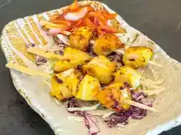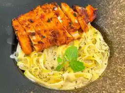 Spaghetti in white sauce served with fragrant, tangy, and spicy grilled chicken
