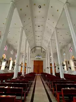 The interior of the church features stained glass depicting scenes from the Bible, and the ceiling is decorated with stars resembling the sky.