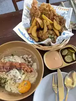 This fried chicken shop, which used to be a photo studio, has a vintage, old-school vibe. The star of the show is the fried chicken! The pieces are huge, juicy, and crispy. Dip it in the shop's dipping sauce and it's absolutely delicious! 😋