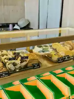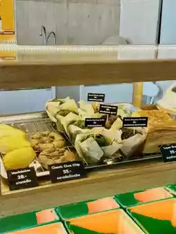 The drink menu offers a wide selection, starting with an Americano, which is as cheap as 55 baht. They also offer a variety of pastries, including muffins, cookies, and layered bread.