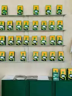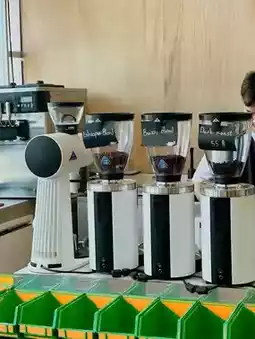 The interior is spacious, with plenty of seating. The seats are made of foam, and the shop is decorated with clear plastic, creating a unique look. The counter is decorated with beautiful green plastic crates.