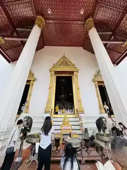If you're looking for a peaceful place to recharge your spirit, consider visiting Wat Suthat Thepwararam. Located right by the Giant Swing in the center of Bangkok, it's incredibly convenient to get to. Inside, you'll find Phra Si Sakkayamuni, a large and magnificent principal Buddha statue that is both beautiful and sacred. The surrounding atmosphere is enchanting, with the charm of an ancient temple that retains its classic beauty. Plus, it's a great spot for photography, featuring the chapel, the viharn, and the iconic Giant Swing in front.