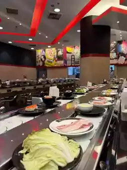 Shabushi Buffet is a conveyor belt shabu restaurant offering sushi and a wide variety of other dishes. The restaurant serves fresh food on a conveyor belt, including beef, pork, bacon, shrimp, clams, and fresh vegetables, rotating throughout each seating area. In addition to the shabu and hot pot, the restaurant also offers sushi, tempura, fried food, side dishes, desserts, fruit, and ice cream. Prices are as follows: