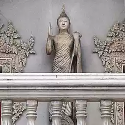 🏠 The Chinese-style ordination hall, featuring a two-tiered roof. The upper gable houses ceremonial offerings, with a vase in the center flanked by two cloud-riding dragons facing the vase. The hall is adorned with antique porcelain and has been registered as a historical site by the Fine Arts Department.