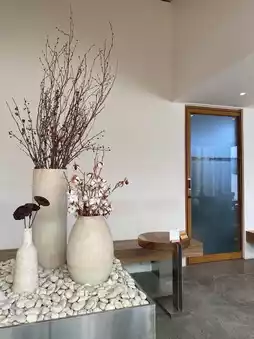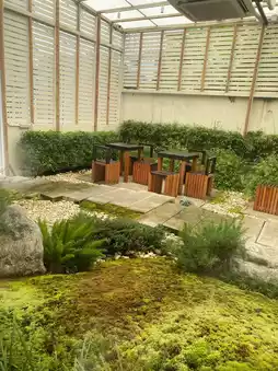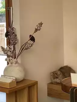 🛋️ The cafe's interior is decorated in warm, simple tones, with small tables for working and a seating area for relaxing. The photos look lovely and soothing to the eyes.