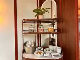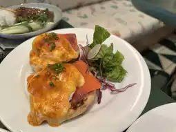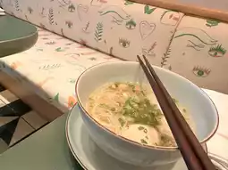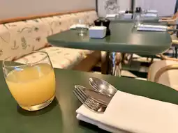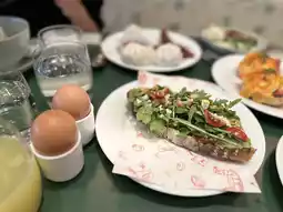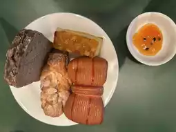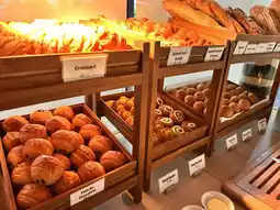 For breakfast, order a few items and add fruit, bread, dumplings, and more from the buffet area.