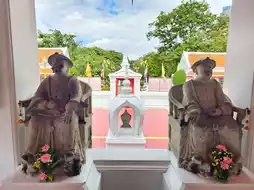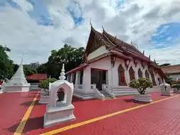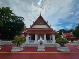 It is believed to have been built during the Ayutthaya period, later during the reigns of King Rama I and later during the reigns of King Rama III. Located on Chiang Mai Road, just off Somdet Chao Phraya Road, the temple entrance is on the left. Upon entering, you'll see the ordination hall behind a wall. It features a traditional style with a gabled finial, a raka-hang-hong design, and a ship-shaped arched base in the Ayutthaya style. There are palais at both the front and back, facing east toward the Chao Phraya River. Sema stones are enclosed in arched niches at the top of the chedi in eight directions. There are twelve-angled recessed chedis at each corner. The principal Buddha image is Phra Buddha Chinnachat, depicting the subduing Mara posture. Inside, traditional murals are displayed. Behind the principal Buddha image is a depiction of the Traibhumi (Triple World), while in front is a depiction of the subduing Mara. Above the windows are depictions of the gathering of deities.