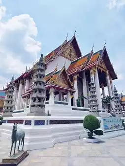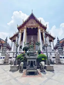 #GetDiscountNotDependingOnLuck Wat Suthat Thepwararam [Su-tat-thep-pa-wa-ra-ram], or popularly known as Wat Suthat, is a first-class royal temple of the Ratchaworamahawihan type, which exists in only a few places in Thailand. It is considered the temple of the reign of King Ananda Mahidol, the Eighth King. It is a temple located in the inner city area and has a prominent structure, the Giant Swing, in front of the temple. In the early Rattanakosin period, King Rama I[1] ordered the construction of a temple in the inner city area in 1807. Originally named "Wat Maha Sutthawat", the area was located in Dong Sakae, a low-lying area, so he ordered the land to be filled and a temple built. He also ordered the construction of a viharn (wihan) first to enshrine the Phra Sri Sakyamuni (Phra To), which was invited from the royal viharn of Wat Mahathat, Sukhothai Province. However, before the temple was established as a sangkharam, it was later called Wat Phra To, Wat Phra Yai, or Wat Sao Chingcha. It was not until the reign of King Rama II that the temple was extended and he carved the doors of the viharn himself. However, his reign ended before the temple was completed. The temple was completed in the reign of King Rama III in 1847, and it was named "Wat Suthat Thepwararam." It is recorded in historical records as "Wat Suthat Theptharam." During the reign of King Rama IV, the principal Buddha images in the viharn, the ubosot, and the sermon hall were given the same names: "Phra Sri Sakyamuni," "Phra Phuttha Trilok Chet," and "Phra Phuttha Setthamuni."