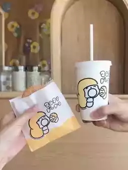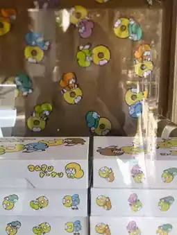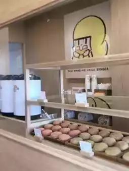 🍩🥭 Mamuang Donuts, a donut cafe featuring cute mango characters from a famous creator. Located near the Democracy Monument, the shop is decorated in a monochromatic yellow mango color. It's an open-air cafe offering a variety of donuts and fillings. They also offer tea, coffee, and non-coffee drinks. But don't miss the donuts! The bags and cups are adorned with cute mango characters.