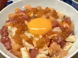 Thick salmon slices on top of rice + premium egg yolk / toppings as per the menu
