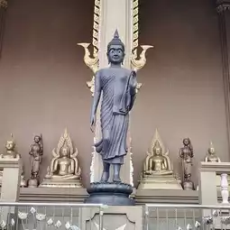 Outside the Ubosot is a statue of the Buddha in the Walking Posture. Behind it is the old Ubosot and bell tower.