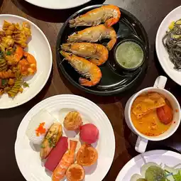 The food here uses high-quality ingredients and generous portions, offering a satisfying and satisfying experience at a reasonable price. The international buffet offers a wide selection of dishes, including grilled river prawns, sashimi, sushi, Thai dishes, baked spinach with cheese, salads, pork sago, pumpkin soup, tempura rice, Thai desserts, cakes, and fruit.