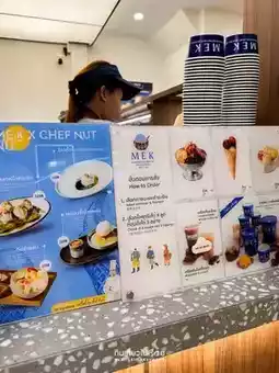 I didn't know that Mek Ice Cream had a branch in Banthat Thong. I've been craving it for a long time, but I've never been to Bangsaen. 😂 Walking past the shop in confusion, it was like a reminder of my cravings, so I decided to give it a try. It was almost midnight, but the shop was still open. It's a small corner room with about 5-6 tables.